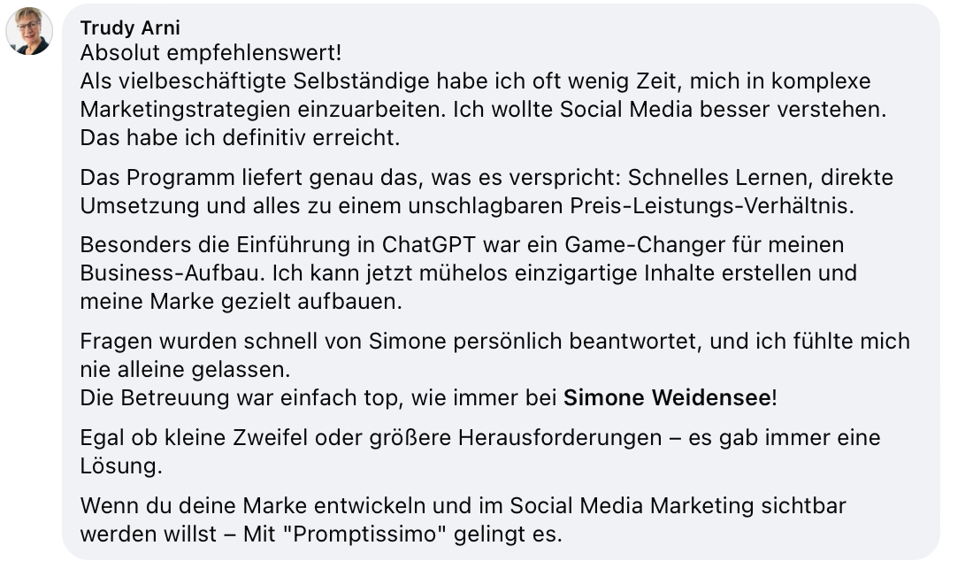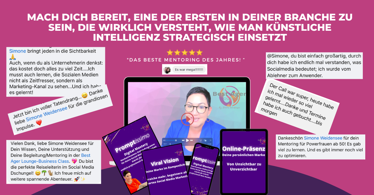 Mit Promptissimo rüste ich Dich mit einer Waffe aus, die Deine Konkurrenz vor Neid erblassen lässt. Du erhältst eine Strategie, die auf der mächtigen Kombination von KI und Social Media basiert, um Deinen Geschäftsaufbau revolutionär zu verändern. Wir sprechen hier nicht von gewöhnlichem Marketing – wir sprechen von einer unübersehbaren Dominanz in Deinem Markt.